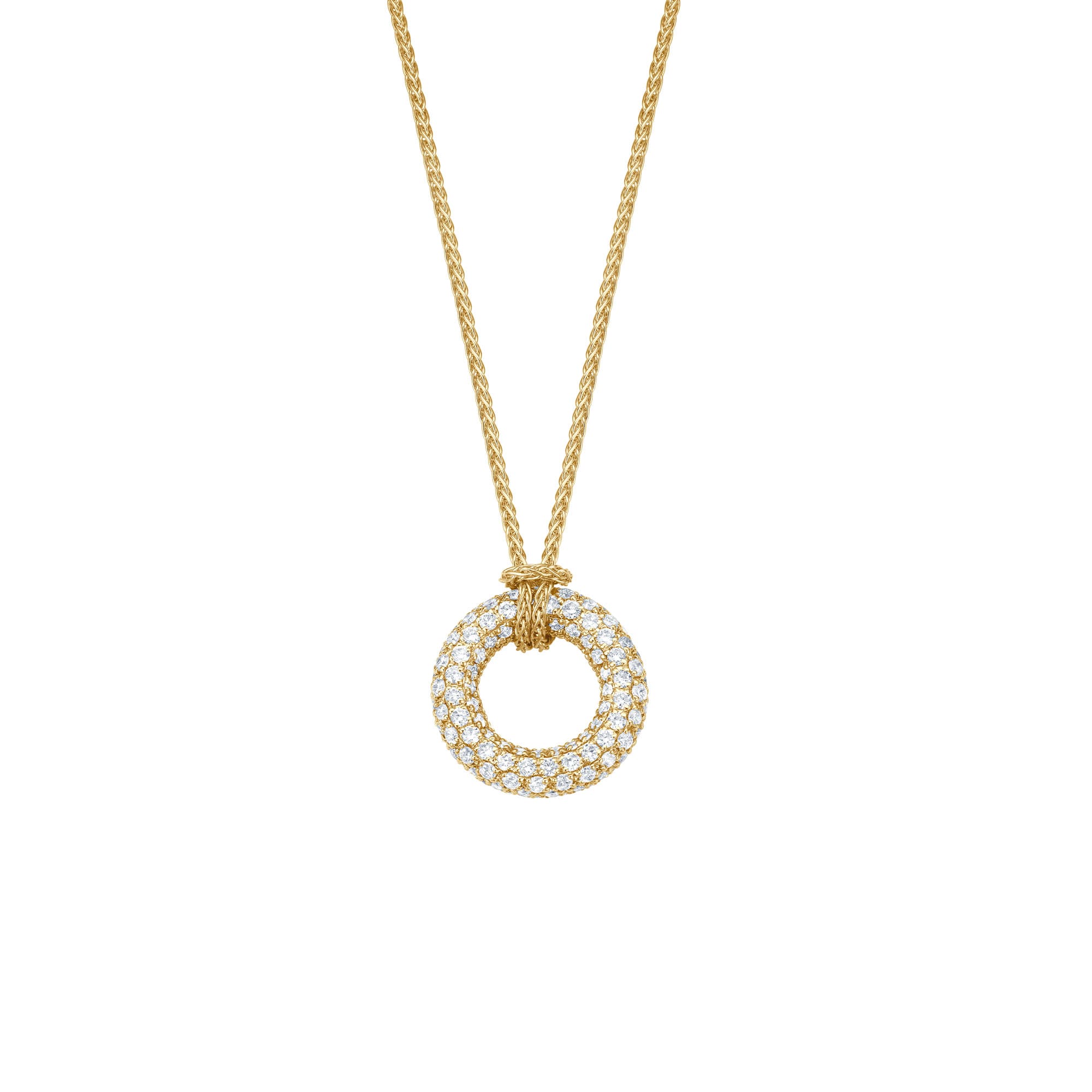 Das können wir leider auch nicht – aber unser Goldanhänger mit opulentem Diamantbesatz ist nah dran! Er erinnert mit seiner runden Form und dem warmen Ton des Gelbgolds an einen Strohkranz – einen besonders brillanten allerdings: 168 Diamanten zieren das Juwel und leuchten hell. Die Flechtoptik der Goldkette betont den natürlichen Look. Schmuck, der Sie durchs Leben begleitet – bei einem Picknick am Feldrand ebenso, wie zu einer großen Abendgala.